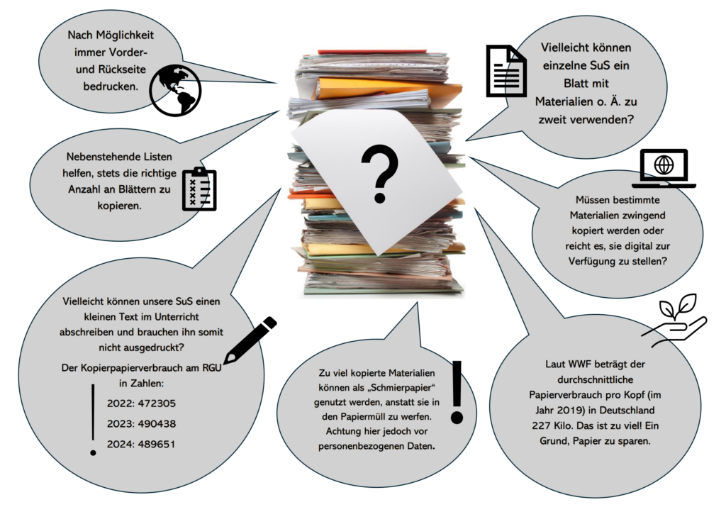 An Waschbecken wurden außerdem die bisherigen Papierhandtücher durch recyclebare ersetzt. Seit kurzem ist der Kopierraum mit einer exakten Übersicht ausgestattet, die angibt, wie viele Kopien jede Klasse bzw. jeder Kurs tatsächlich benötigt. Gerade in den höheren Jahrgangsstufen nutzen nicht wenige Schülerinnen und Schüler ein Tablet, sodass die Anzahl der Kopien reduziert werden kann.