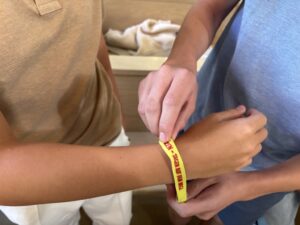 Physikalische Aspekte der Sonne führten dabei zu meditativen Gedanken: So wie beispielsweise das Licht Zeit braucht, bis es auf der Erde ankommt, brauchen auch Gedanken, Lerninhalte und gute Worte manchmal ihre Zeit, bis sie Wirkung entfalten. Beim Thema „Sonnentemperatur“ lenkten Pfarrerin Weishaupt und Pater Christian den Blick auf die soziale Wärme, die in einer Schulgemeinschaft wichtig ist. Als sichtbares Zeichen dafür erhielten alle Schülerinnen und Schüler ein Armband mit dem Gottesdienstmotto, das sie einander gegenseitig – verbunden mit einem Wunsch – anlegten.