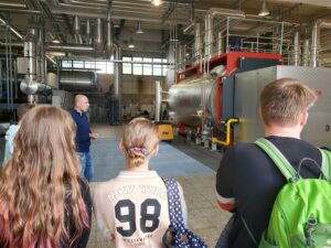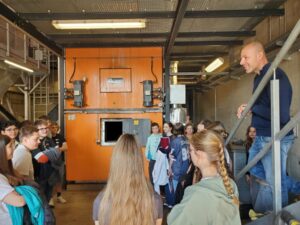 Einen besonders anschaulichen Einblick in die Themen des Heizens und der Stromerzeugung erhielten die Schülerinnen und Schüler bei einer Führung durch das Heizkraftwerk des Dominikus-Ringeisen-Werks, geleitet durch Herrn Schuler. Dabei erfuhren sie, dass unser Gymnasium seine Wärme und seinen Strom vollständig vom Heizkraftwerk des DRW bezieht. Die Energie wird dort aus erneuerbaren Quellen wie Photovoltaik, Wasserkraft und Holz sowie anteilig aus fossilem Erdgas gewonnen. Die dabei entstehenden CO₂-Emissionen werden jedoch durch den Erwerb hochwertiger Emissionszertifikate vollständig kompensiert.