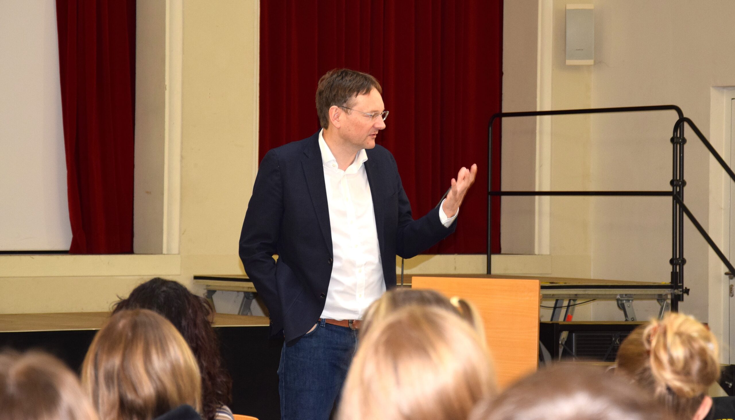 Mehr als eine Stunde lang stellte sich Landrat Reichhart für eine spannende und aufschlussreiche Frage-Antwort-Runde zu Verfügung. Hierbei ging er stets mit der nötigen Transparenz und Nähe auf die Fragen der Schülerschaft ein und erklärte verschiedenste Abläufe und Ziele eines Landratsamtes. „Wir kümmern uns um alles, was das tägliche Leben betrifft“, beginnt Reichhart, während er auf diverse Errungenschaften im Landkreis Günzburg eingeht.
